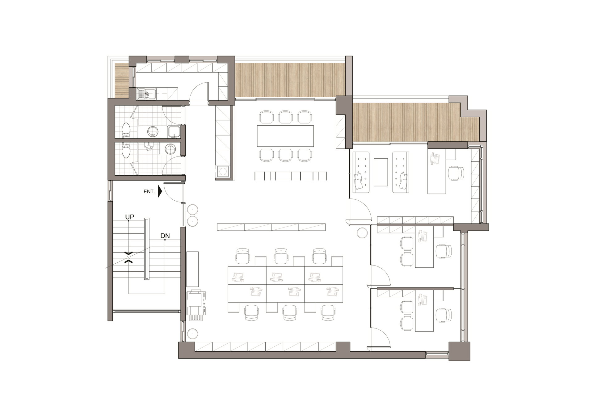 공간계획은 복잡한 변화보단 공간을 나누되 하나의 공간처럼 보일 수 있도록 솔리드한 벽체나 블라인드 없이 투명한 공간으로 계획하였다. 각 조닝의 구분도 벽을 막되 망입유리 창으로 막아 채광이나 뷰를 모두 살려내어 각자의 자리에서 사계절의 변화를 느낄 수 있게 하였다. 공간과 공간이 단절이 아닌 소통하는 하나의 공간으로 만드는 게 중요했다.